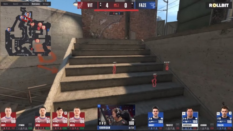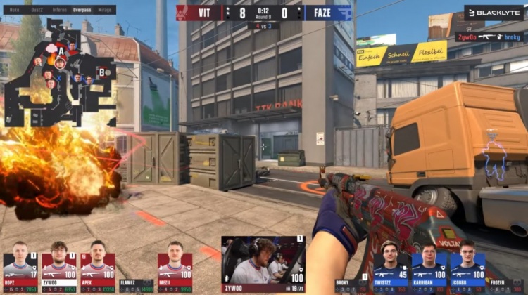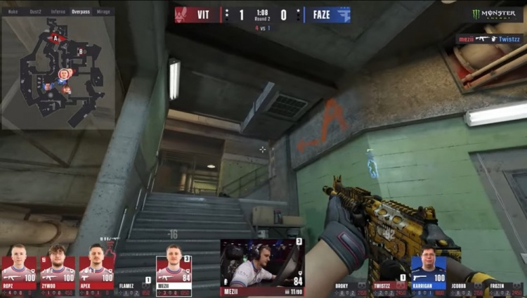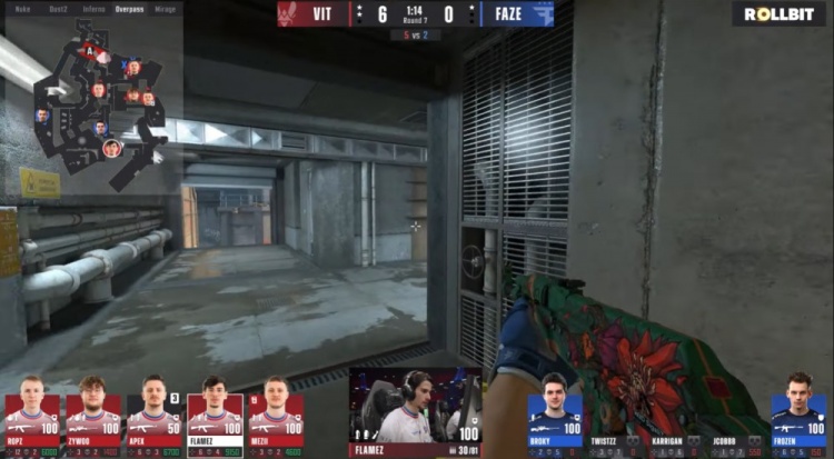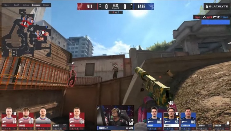 上半场小蜜蜂先攻,手枪局FAZE两A三B防守站位,寒王看住长管先杀火仔,ropz摸进长管打掉jcobbb与寒王,总监回到B点,但ropz单局四杀,VIT1-0FAZE。