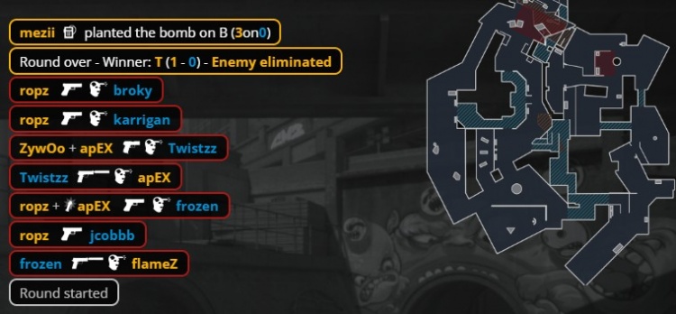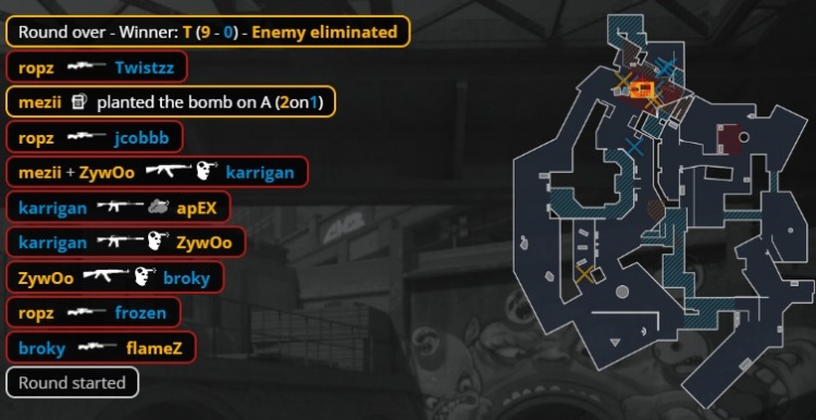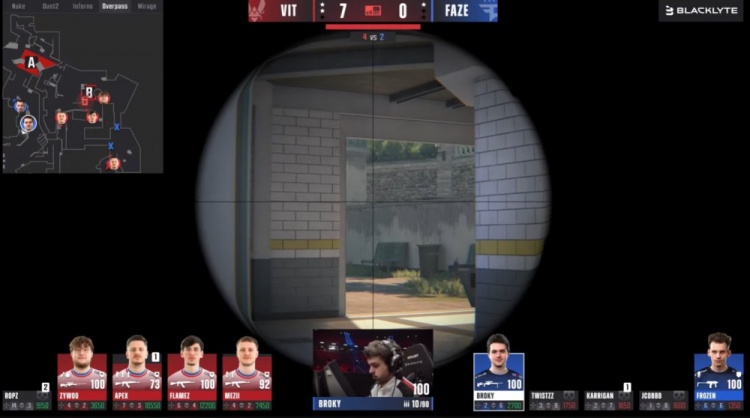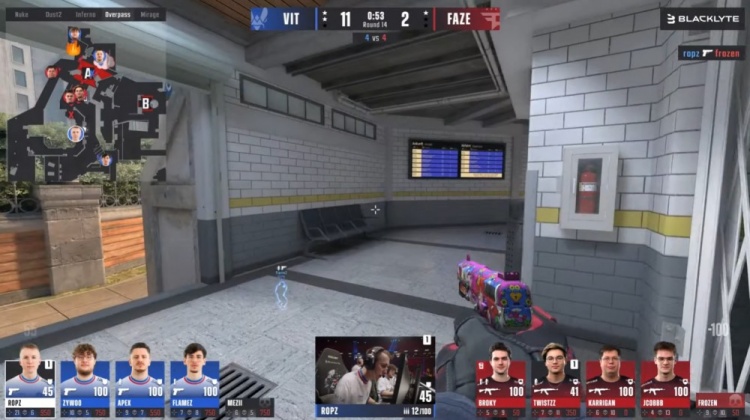 第12局broky厕所大狙轰掉mezii,总监A小击杀ropz后回到A点击杀Zywoo帮助FaZe拿到首分,VIT11-1FAZE。