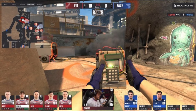 第10局Zywoo进攻大狙来A大爆轰broky与总监,ropz进B换掉大表哥,Zywoo来B再轰jcobbb完成单局三杀,火仔在B下包,VIT10-0FAZE。