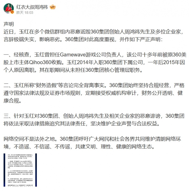 针对玉红对360集团、创始人周鸿祎先生及相关企业家的恶意诽谤,360集团将依法采取法律措施追究其法律责任,坚决维护企业声誉与合法权益。”