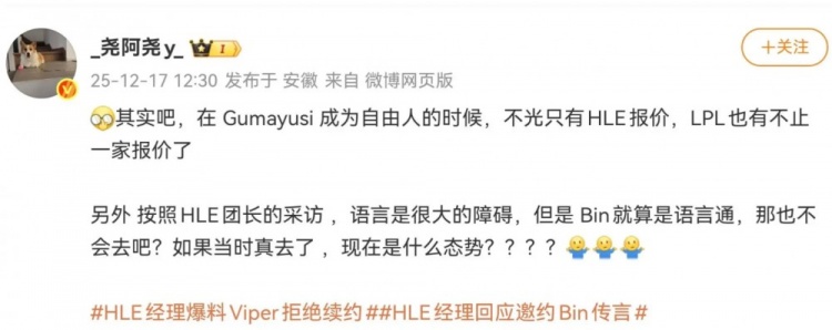 其实吧,在Gumayusi成为自由人的时候,不光只有HLE报价,LPL也有不止一家报价了