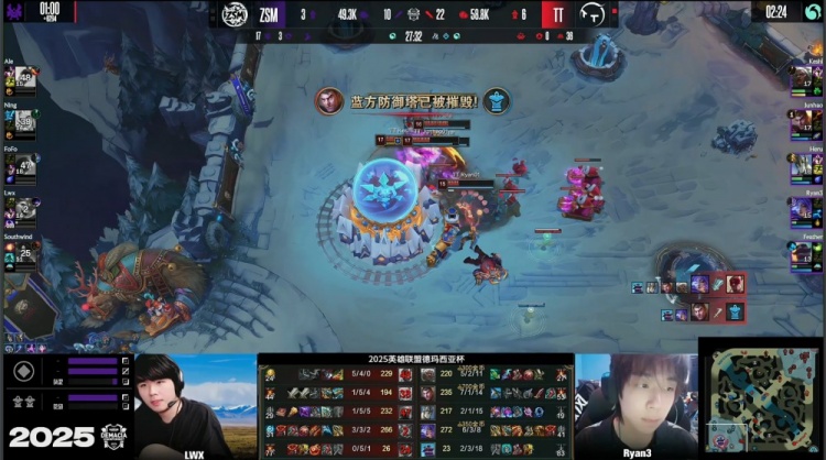 第二局前期小龙团南风牛头被Ryan3芸阿娜拿到一血,随后Lwx斯莫德三杀收割,ZSM打出2换3。TT双人组换线去上遭Ale盲僧双杀,宁王吃掉三条巢虫,Ale盲僧下路越塔单杀Keshi,随后TT上野联动击杀Ale。