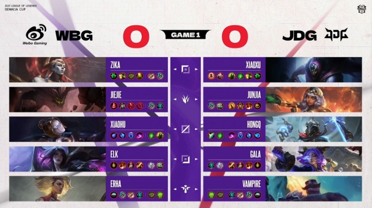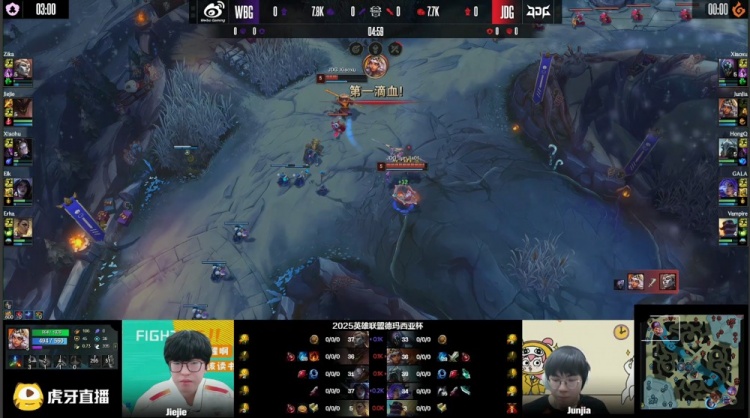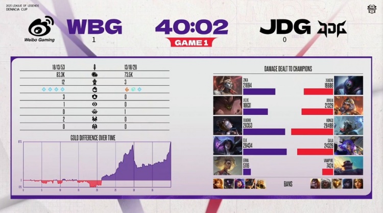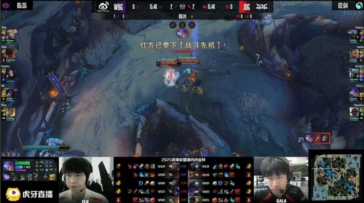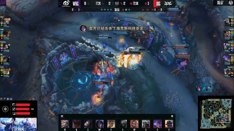 中期双方围绕小龙与厄塔汗展开争夺,厄塔汗团战,Zika亚恒配合Elk卡莎进场,Jiejie石头人大招撞飞JDG四人,WBG击杀JDG多人并拆掉上路一塔,后续WBG反打击杀JDG上野并拿到大龙,接连推掉JDG水晶建立经济领先。