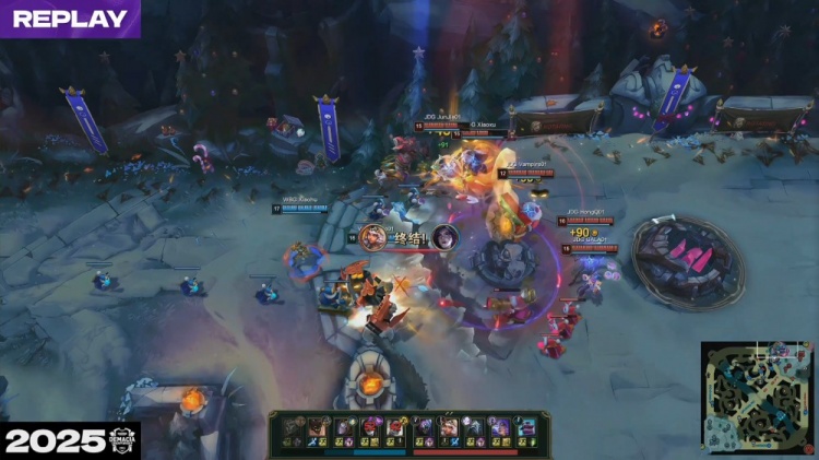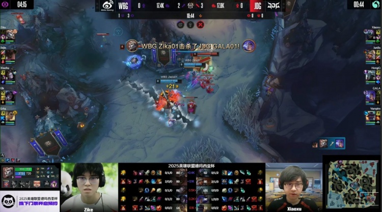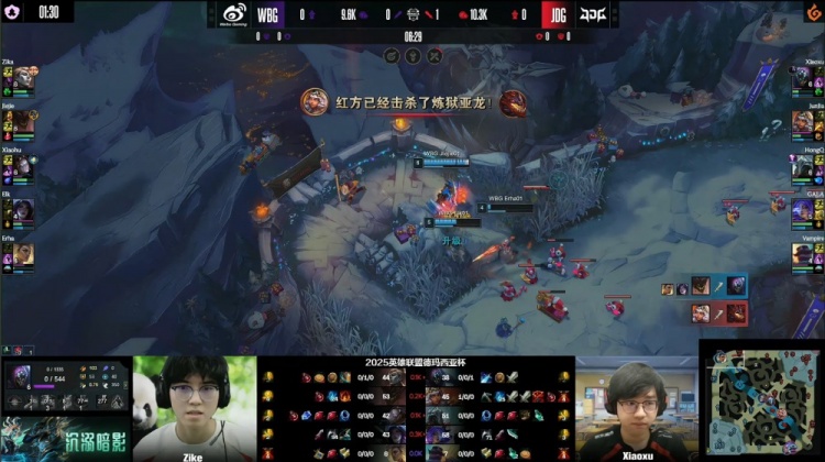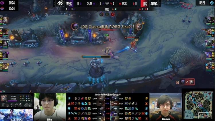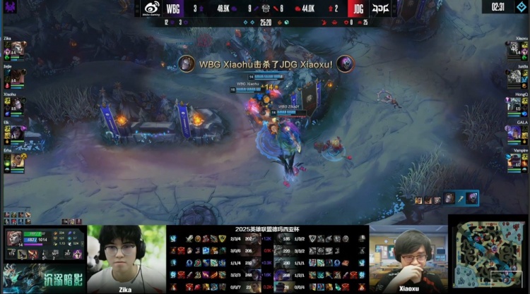 【25:15】下路Zika亚恒被抓被打出复活被动,WBG众人到位反杀JDG上野,WBG回头拿到大龙,经济领先4k。