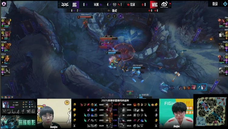 【15:12】中路团战,HongQ岩雀开车送到Jiejie嘴儿里,Erha波比也被击杀,双方打出1换1,Xiaoxu奎桑提推掉WBG下路一塔,中路再战,Elk韦鲁斯被HongQ岩雀抬回后又被Junjia蔚锁头互换,GALA希维尔点掉Jiejie,JDG打出1换2。