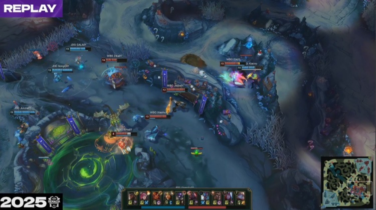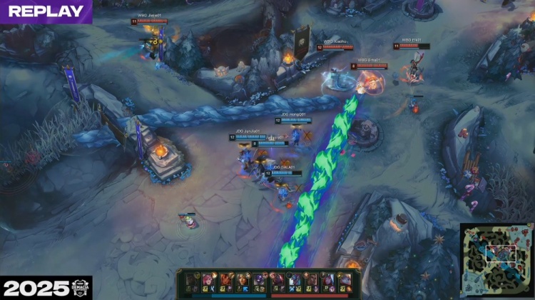 第二局前期WBG一级团主动入侵JDG野区送出Jiejie巨魔一血,巢虫团JDG打出1换3,中路团战HongQ岩雀抬飞Elk接Junjia蔚锁头将其融化,JDG打开局面。