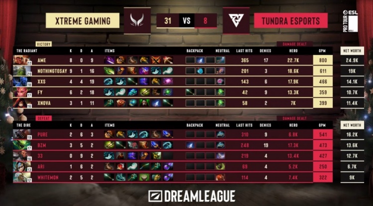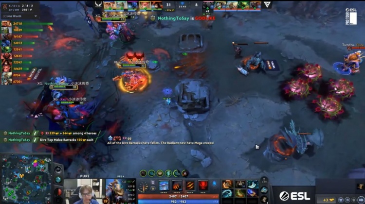 后期NothingToSay小小多次将33斧王扔回,Ame巨魔单杀Pure拍拍,Xxs夜魔冲上高地开杀,Tundra毫无一战之力敲出GG,XG先下一城。