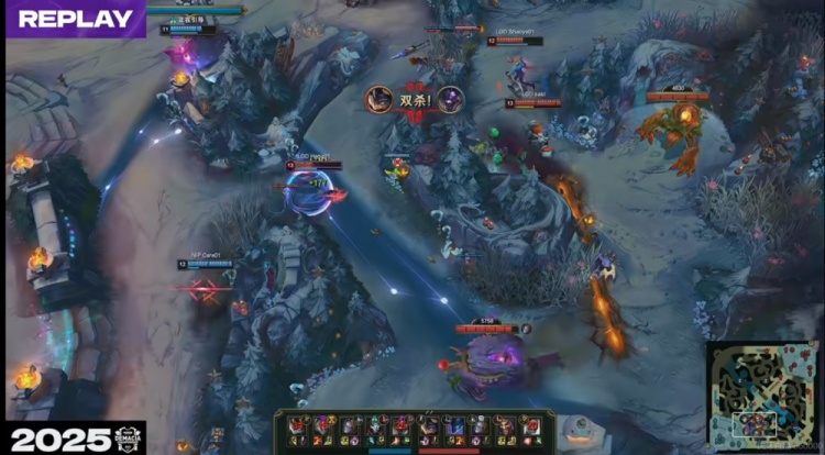 【6:50】河道双方上野2V2,没闪的HOYA兰博先倒,Heng梦魇趁着这个经验差还升6级了!自己凯旋回一口血之后关灯反手飞到了Guwon杰斯!这波Heng梦魇双杀啊!LGD的0换2!