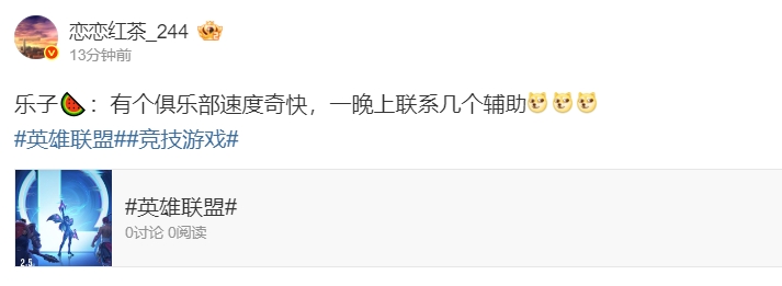 今日德玛西亚杯第二轮的比赛正在进行中,而在昨日比赛中WBG爆冷遭OMG横扫。而今日微博爆料人恋恋红茶更博爆料:有个俱乐部速度奇快,一晚上联系几个辅助。