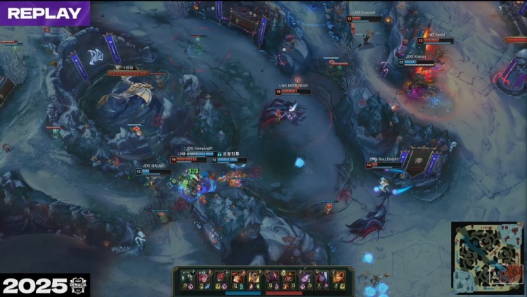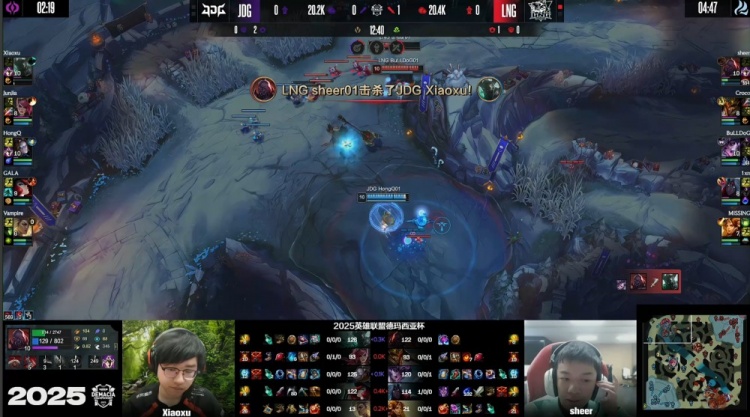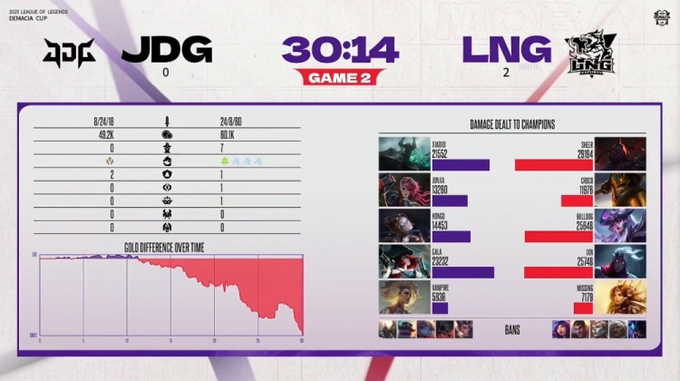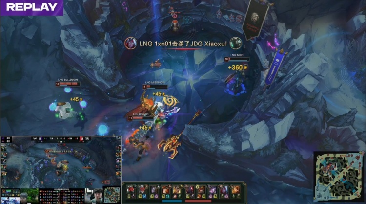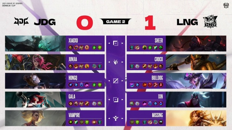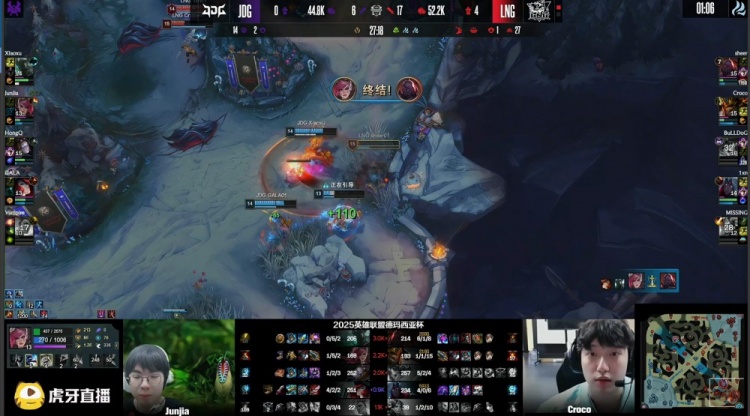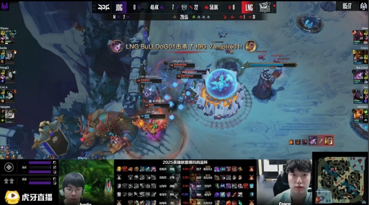 中期Junjia连续阵亡,厄塔汗团战1xn击杀Junjia,BuLLDog辛德拉闪现EQ双杀,GALA女枪反手三杀难逆天,sheer赛恩大僵击杀GALA,LNG打出3换5团灭JDG,随后再控厄塔汗,经济领先6k。