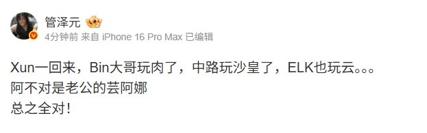 管泽元:Xun一回来,Bin大哥玩肉了,中路玩沙皇了 总之全对!