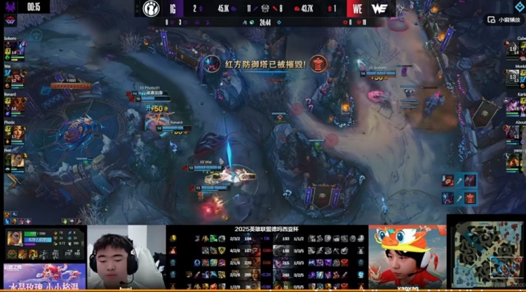 【15:33】WE拿下峡谷先锋,yaoyao泰坦贴脸空钩,结果自己和Monki安蓓萨被Wei猴子闪现大招全部留住!iG打出0换2,拆掉WE上一塔!