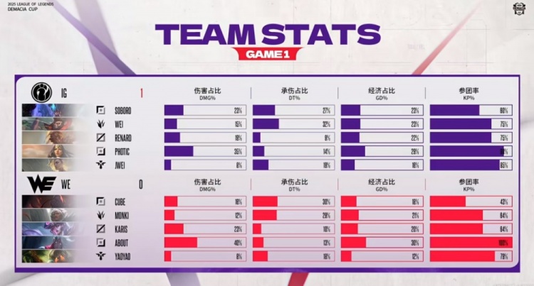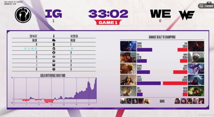 首局比赛yaoyao泰坦前期空钩+Monki安蓓萨团战无限空大,AD的About则是上路TP+下路埋草连续开送成为害人鲸!iG这边则是Jwei芮尔和Wei猴子无脑强开有赚有亏,不过Photic希维尔状态不错打满了输出!正面iG掌握优势先后拿下厄塔汗+海克斯龙魂+大龙之后奠定了胜局!最终随着下路团iG强开一波2换5团灭WE,iG一波结束掉了首局比赛,先拿一分!