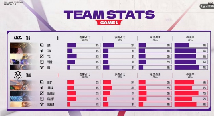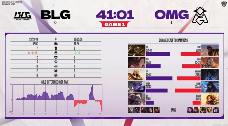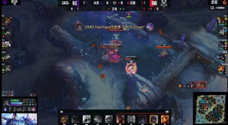 比赛进入后期,BLG虽然拿下二大龙但是正面Bin鳄鱼和ON波比曲线都是往下走的,最大输出点Viper芸阿娜团战要面对OMG三人甚至四人的强开,有闪有金身都活不下来!而OMG这边Starry厄斐琉斯装备成型输出拉满,最终中路团OMG一波2换4之后结束比赛,先拿一分!