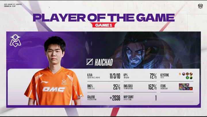 直播吧12月23日讯 Haichao凭借塞拉斯多次R偷到石头人大招,首局砍下11/3/10豪华两双数据,拿下MVP!