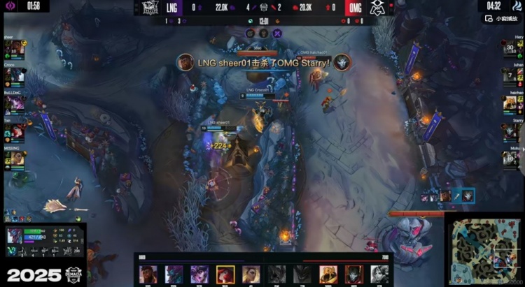 【12:31】OMG拿下小龙,LNG强开留人Juhan墨菲特大招撞到了河蟹没能过墙啊!残局Moham曙光还想反开但是Hery剑魔伤害实在不够啊!残局Croco巨魔闪现柱子再卡两个,这波LNG打出1换4!