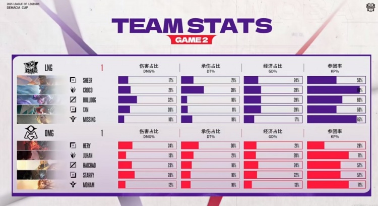 第二局比赛前期LNG掌握主动权,Juhan墨菲特前期毫无作为,几次大招都是用来逃跑宛如霸哥附体了!12分钟小龙团LNG大获全胜之后扩大经济差,随后2V2下路组对拼还是1xn女枪双杀!厄塔汗团OMG想来看但是墨菲特没大啊!这波LNG再留对手四人,滚起了雪球!最终中路团haichao沙皇一打三配合队友强杀1xn女枪,但是正面LNG中野实在太能打了,BuLLDoG辛德拉三杀收尾,LNG扳平了比分!