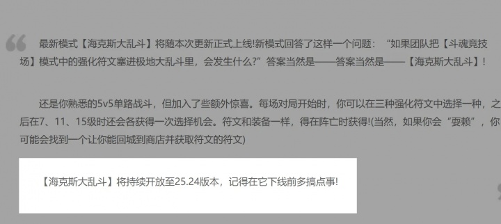 直播吧12月25日讯 按照此前LOL国服公布的版本更新公告,“海克斯大乱斗”模式将持续开放至25.24版本。