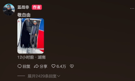 他还在视频评论晒出一张自己的照片,并配文“敬自由”;据显示,蓝战非目前ip地址为湖南。