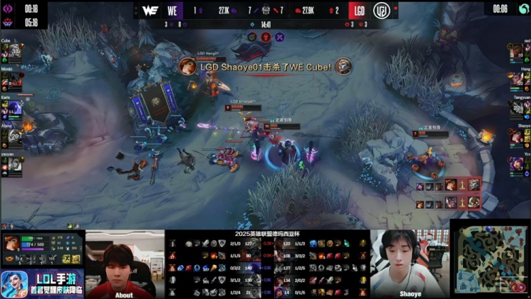 【25:44】小龙团,Ycx妮蔻开四人,Shaoye女枪开扫,WE上中辅三人瞬间睡着,About飞机不走也跟着被杀,LGD打出0换4去开大龙,WE众人复活过来看大龙复活葫芦娃救爷爷,Cube亚恒空大,LGD吃掉大龙打出4换5。