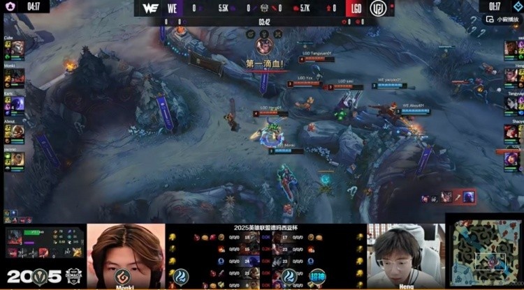第二局前期河道遭遇,Heng赵信击杀Karis瑞兹拿到一血,但WE依靠人数优势打出2换3。