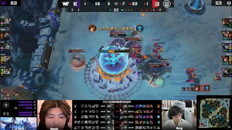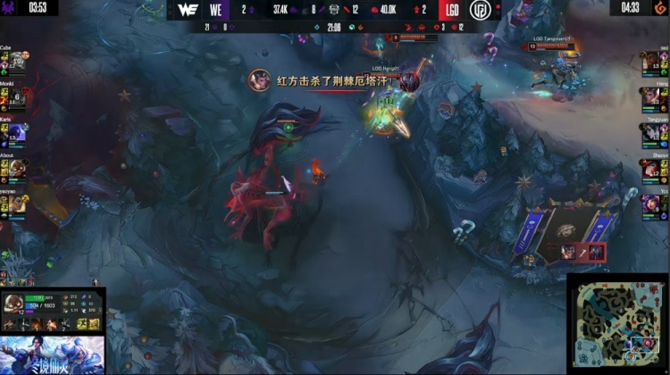 【22:01】LGD入侵WE上野区,Ycx妮蔻开WE三人后人头送给Cube,shaoye女枪姗姗来迟,Monki剑魔砍掉Heng赵信,WE打出1换3,经济落后1k。