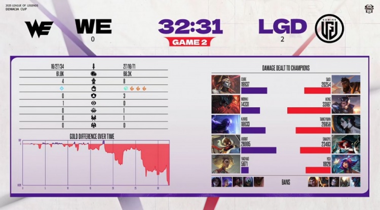 直播吧12月25日讯 2025德玛西亚杯小组赛第二阶段继续进行,今日首场WE遭LGD横扫,WE总战绩0-4,小分0-8出局。