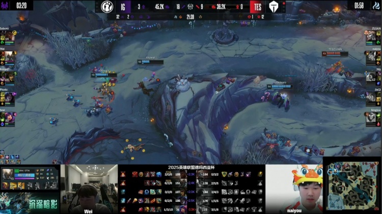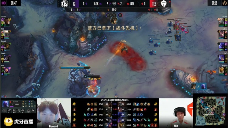 中期先锋与小龙连续交锋,Wei潘森先手击杀naiyou赵信,Photic卡莎正面击杀Nia瑞兹,iG打出2换4并推掉TES中路一塔,经济领先扩大到6k。