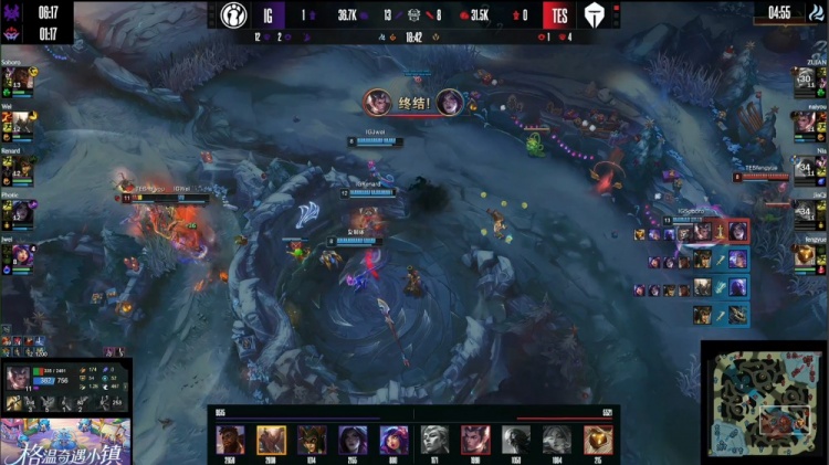 后期厄塔汗争夺中,Jwei妮蔻先手配合Wei潘森连续击杀TES众人,iG打出0换4将经济拉开至1w以上。随后大龙团TES收汁,iG打出1换4,一波推平TES基地扳回一城。