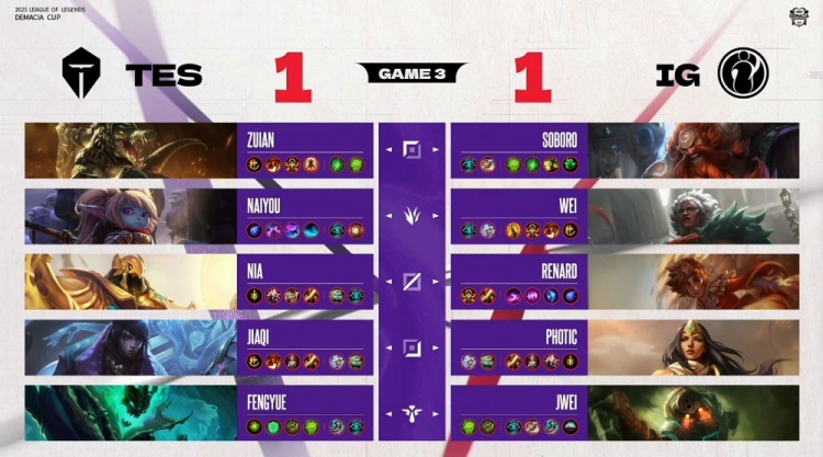 直播吧12月26日讯 2025德玛西亚杯来到线上单败淘汰赛阶段,首场比赛由TES对阵iG!