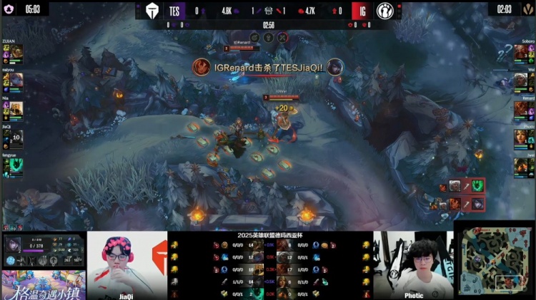 第三局前期下路对拼,JiaQi厄斐琉斯先手击杀Photic希维尔,但Wei安蓓萨随即绕后配合Renard岩雀击杀TES下路双人组,iG建立人头优势并拿到三条巢虫,经济领先1k。
