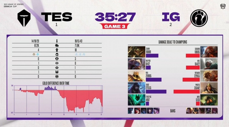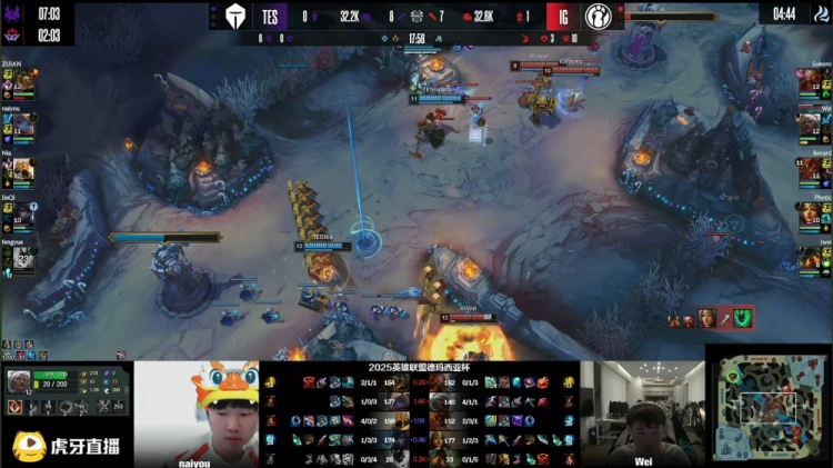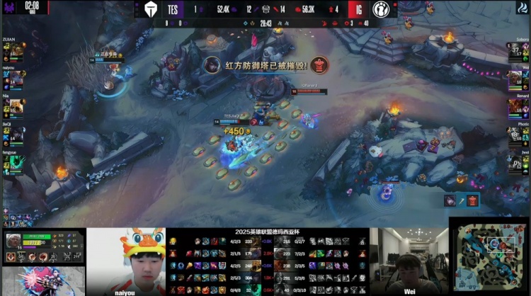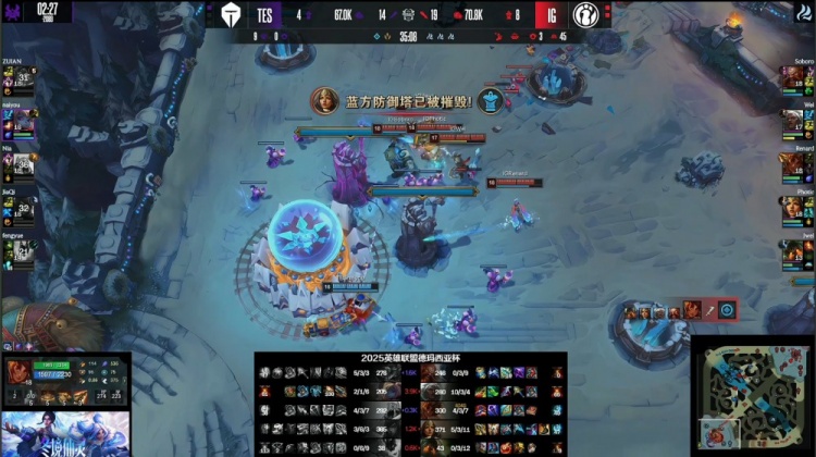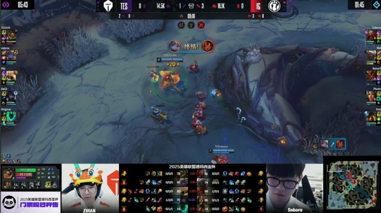 后期双方围绕大龙拉扯,naiyou波比拿到大龙,但Wei安蓓萨斩获三杀再次融化JiaQi厄斐琉斯,iG打出0换4,一波推平TES基地拿到赛点。