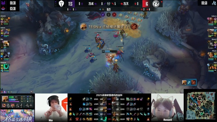 【16:21】Nia沙皇下路单杀Renard岩雀,上路Wei安蓓萨配合Soboro酒桶逮捕ZUIAN鳄鱼,双方经济持平。