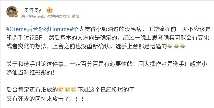 个人觉得小奶油说的没毛病,正常流程前一天不应该是和选手讨论BP,然后基本的大方向是确定的,经过一晚上思考确实可能会有变化或者突然的想法,上台之前也没重新确认,选手上台都是懵逼的