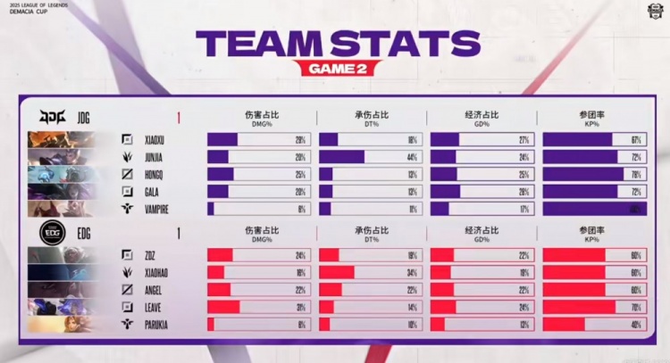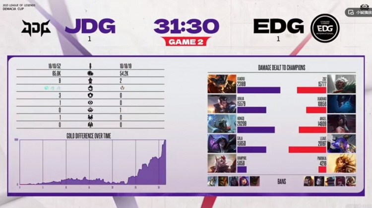 第二局比赛HongQ维克托前期对线压住了Angel阿卡丽,但是中期Angel阿卡丽有装备了直接边路单切xiaoxu兰博!中期EDG借助梦魇开飞连续gank,JDG也不甘示弱,抱团给足资源压力!第四条小龙团成为转折点,Angel阿卡丽单人卡后排直接开飞被打残,xiaohao梦魇开大还没救下他!自己飞GALA卡莎也白给了!这波JDG打出0换3,收下大小龙拉开5K经济差!最终团战野区狭窄口子里,兰博+维克托双大招输出拉满,JDG一波兰博和卡莎的2+3完成收尾,团灭EDG扳平了比分!