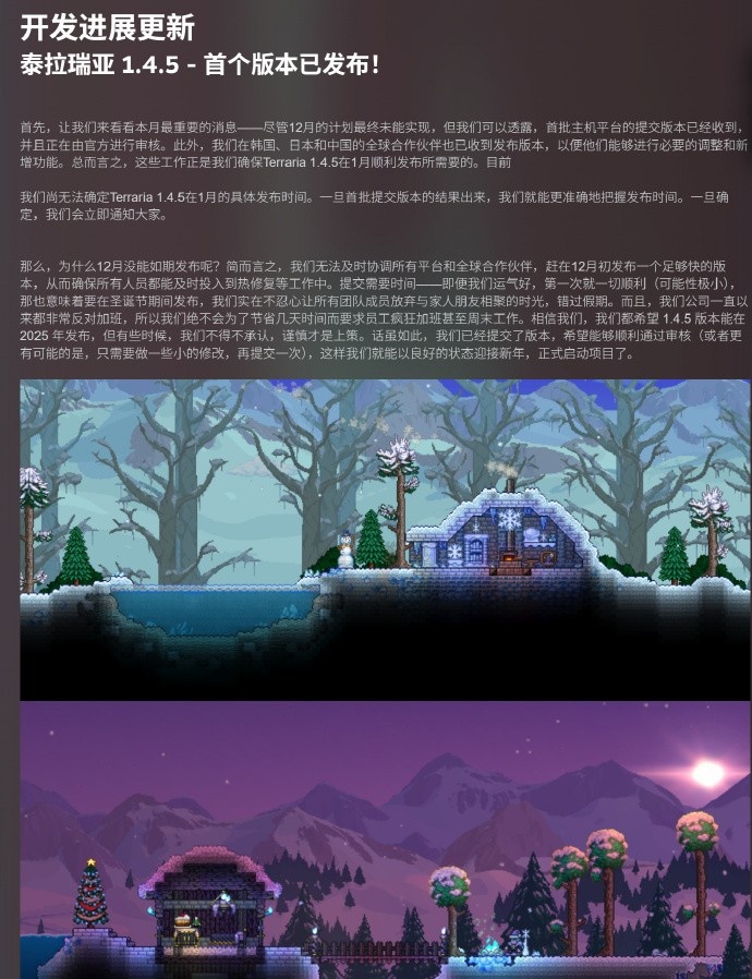 直播吧12月27日讯 《泰拉瑞亚》发布新公告:1.4.5版本将于2026年1月推出。