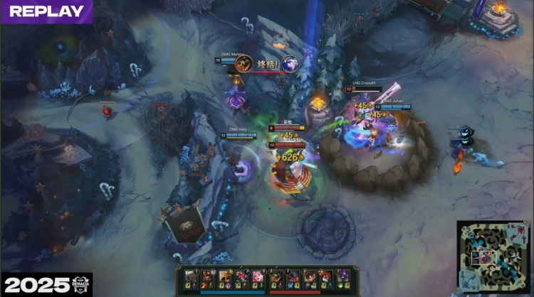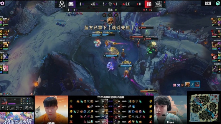 第三局前期OMG围绕上路与野区持续发力,Juhan皇子上路gank取得成效,河道Juhan皇子1v2戳穿sheer&Croco。OMG一度将经济差距拉开。