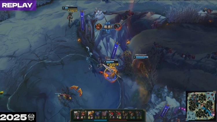 【11:47】上路河道2v2,Juhan皇子先杀sheer鳄鱼再杀Croco剑魔,OMG打出0换2,经济领先2k。