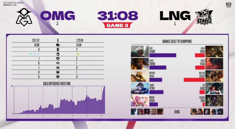 中期sheer鳄鱼落单被抓,OMG顺利拿下厄塔汗并听牌风龙魂。后期大龙团,1xn女枪扫大配合Croco剑魔下龙坑抢掉大龙,LNG付出上野代价却未能扭转局势。龙魂团,haichao沙皇正面输出击杀LNG双C,Starry艾希完成双杀收割,OMG团灭LNG后一波推进推平基地,拿到赛点。