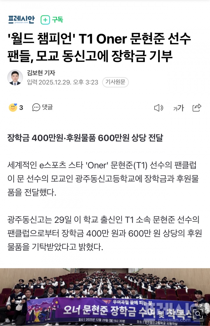 >韩媒:Oner向母校捐赠600w韩元奖学金+400w韩元物资