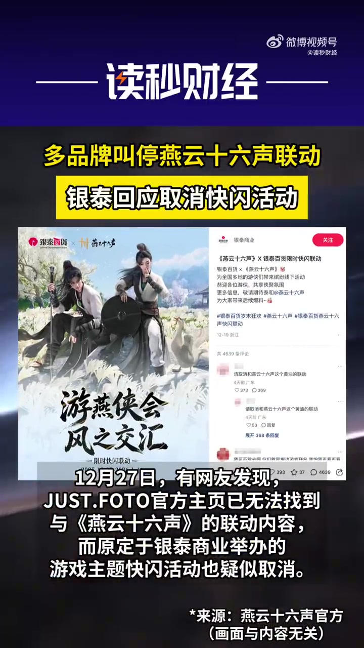直播吧12月30日讯 12月27日,有网友发现,JUST.FOTO官方主页已无法找到与《燕云十六声》的联动内容,而原定于银泰商业举办的游戏主题快闪活动也疑似取消。此前,游戏《燕云十六声》因周年庆时装“飞白成诗”陷入争议,该时装被部分玩家质疑存在软色情设计倾向,涉及未成年角色,引发舆论关注。