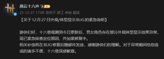 此前,《燕云十六声》已公开回复,“飞白成诗”系列时装上线后实机演示出现异常,部分故障,游戏当日已安排紧急修复,随后再次发布优化方案。