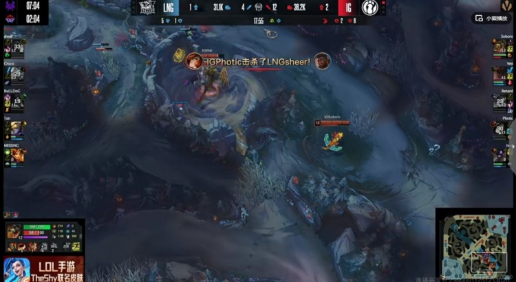 【12:25】野区MISSING曙光被抓,残局LNG想反打,结果被Wei墨菲特隔墙直接创飞两个!BuLLDoG阿卡丽+Croco琪亚娜就差一点伤害被Photic女枪交闪过墙跑了!这两人双双被反杀!这波iG再次打出0换3!快5K经济优势了!