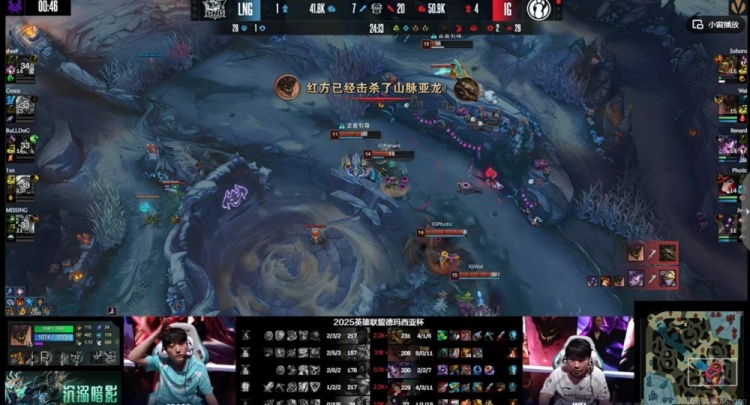 【23:58】小龙团LNG中辅两人都被打掉半血没了状态,LNG想抓对手没大招的时间反打,但是iG众人保护住了Photic女枪让他开出大招!iG双C伤害直接秒掉了LNG中野!残局iG各个击破,双C各自拿下双杀,iG一波轻松0换5团灭LNG,拿下土龙魂!双方经济差来到一万块!