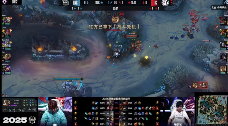 【7:48】1xn库奇下路草丛埋伏想直接单杀Photic卡莎,但是旁边Jwei芮尔在啊!残局Jwei芮尔跟闪切死1xn库奇,自己卡线送塔快速回城!LNG则是换掉了三虫!iG拿下第一条小龙!