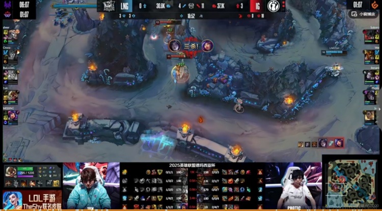 【14:59】小龙团Croco蔚抢到小龙,Wei皇子盖大LNG中野自己先倒,但是Soboro剑魔大灭一开伤害拉满!配合Photic卡莎开飞收割了战局!这波Photic卡莎三杀!iG团灭LNG!拿下4K经济优势!LNG随后换掉峡谷先锋!