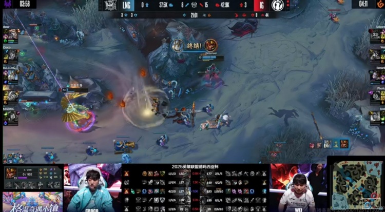 【26:18】Croco蔚野区吃到卡莎虚空索敌直接被秒,iG回头拿下大龙拆掉上二塔+上路高地!LNG则是三人救下强杀掉了Soboro剑魔!高地团LNG前后夹击但是被Wei皇子的金身秀了啊!虽然LNG最终击杀掉了Photic卡莎,但是没人管的Renard发条三杀,iG双C一波2+3结束比赛,iG轻松横扫LNG晋级德杯决赛!