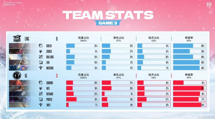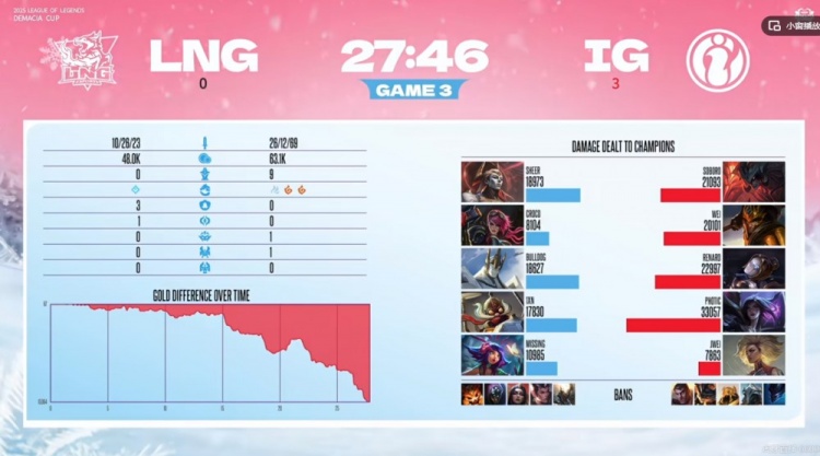 第三局比赛开局1xn库奇被线杀+连续白给直接0-3开局!iG又是早早拿下局势主动权!中期团战Photic卡莎连续收割残局!一局比赛拿下了三次三杀!iG又是中期拉开7K经济差!LNG好不容易抓住iG贪心脱节的时间厄塔汗团击杀iG四人,但是回头强拆一塔又白给了!Croco蔚野区直接逛街白给送给iG大龙!虽然Soboro剑魔下路被强杀,但是上路高地团iG四打五毫无压力,双C一波2+3完成收尾,iG轻松横扫LNG晋级本次德杯决赛!