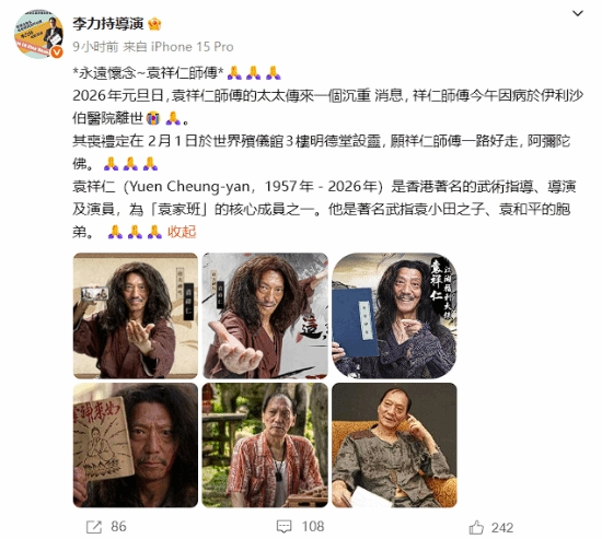 直播吧1月2日讯 香港导演李力持在个人微博上透露,香港著名演员、武术指导袁祥仁1月1日因病于伊利沙伯医院去世,享年69岁。据悉,丧礼定在2月1日于世界殡仪馆3楼明德堂设灵。