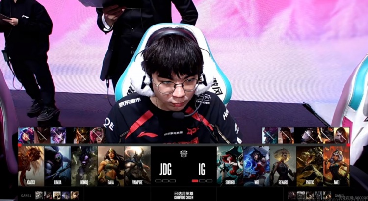 【16:12】JDG拿下先锋,双方辅助各自开后排,但是Soboro鳄鱼TP红怒绕后先切死了GALA希维尔!Xiaoxu贾克斯强行换掉了Photic女枪无济于事!JDG阵型被完全分割,iG各个击破,打出2换5团灭JDG!双方经济差来到4K!